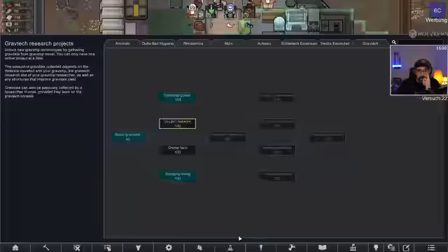 06:58:41Die Orbitalforschung wird vorerst zurückgestellt, da die Graphship Power und damit verbundene Solarpanels als relevanter erachtet werden. Es wird überlegt, Macs zu zerlegen, um Stahl zu gewinnen, jedoch wird dies aufgrund des bereits ausreichenden Stahlvorrats und des begrenzten Lagerplatzes im Raumschiff verworfen. Der Fokus liegt darauf, das Raumschiff nicht zu überladen, da der Raumstoff klein ist und Stahl leicht anderweitig beschafft werden kann. Die Möglichkeit, abgestürzte Kolonisten zur Ausbildung mitzunehmen, wird in Betracht gezogen, aber deren meist verunreinigte Kleidung und der Mangel an Platz im Raumschiff stellen ein Problem dar. Die Forschung für Doppelbetten wurde abgeschlossen, aber es stellt sich heraus, dass keine Doppelbetten vorhanden sind. Stattdessen werden verstärkte Lagerregale und Mannschaftsspinde erforscht, die Komfortboni und Schutz vor Verfall bieten. Zudem werden ein Feuerlöschschaum-System und Orbital Wall Trade Beacons als nützliche Ergänzungen für das Raumschiff identifiziert und deren Bau geplant. Eine Comms-Konsole ist ebenfalls in Planung, sobald genügend Panels vorhanden sind.
