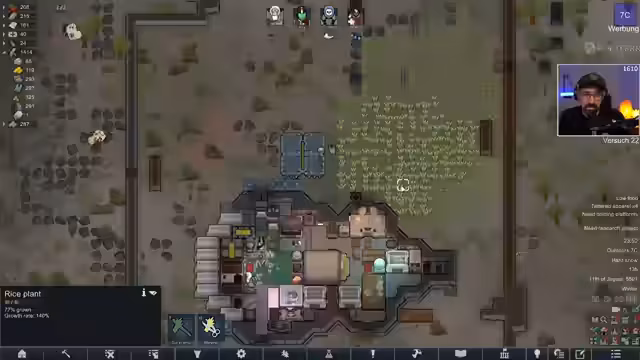 06:46:02Die Spieler bereiten sich auf den nächsten Sprung in die Eisregion vor, wo sie schnell in den Norden müssen, um Nahrung zu finden, da sie keinen Jäger oder Fernkämpfer haben. Sie landen an einem fruchtbaren Feld, um schnell Reis anzupflanzen, da sie in 1,3 Tagen weiterreisen können. Die Forschung an 'Graphship Living' wurde abgeschlossen, und als Nächstes stehen 'Orbital Tech', 'Oxygen' oder 'Graphship Power' zur Auswahl. Ein 'Jamming-Protokoll' wird installiert, um Drop-Raids zu verhindern, und ein weiterer Jammer wird gebaut, da Silber plötzlich eine wichtige Ressource geworden ist. Die Spieler sind bereit, im Notfall einen 'Emergency Launch' durchzuführen, falls Feinde auftauchen. Es wird festgestellt, dass Jade in der Nähe ist, diese aber nicht benötigt wird. Die Probleme mit den Wänden und den Leichen der Gegner werden angesprochen, und ein Kolonist wird von einem Schwein angegriffen, wobei seine Rüstung zerstört wird. Chad, der wichtigste Kämpfer, wird schwer verletzt und bewusstlos, was die Verteidigung gegen die anrückenden Mechs erschwert. Eine MP-Granate schaltet seine Gehirnimplantate aus, wodurch er sich selbst bewusstlos macht. Die Spieler müssen nun ohne Chad gegen zwei Mechs kämpfen und hoffen, zu überleben.