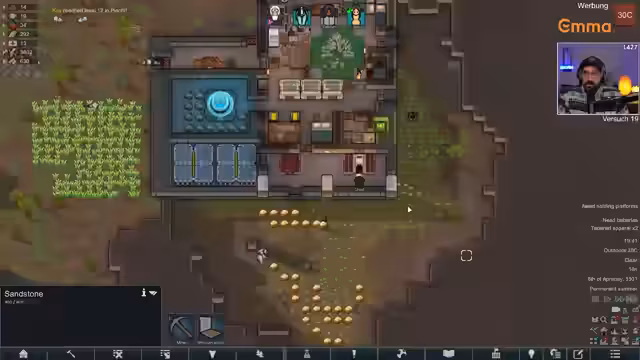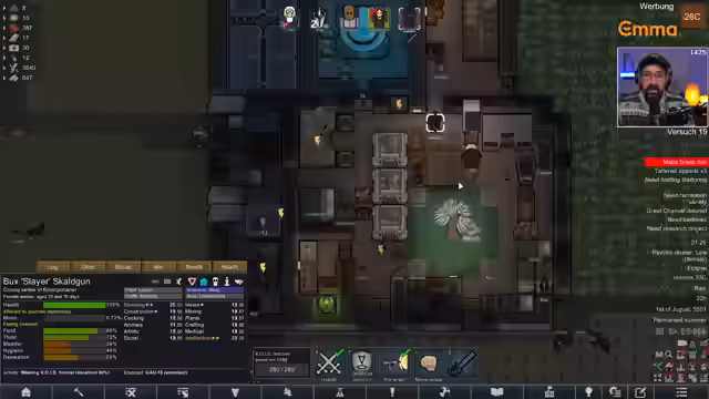 03:30:25Im RimWorld-Run, Tag 62, ist die Kolonie von den Voids bedroht und nutzt einen Raumschiff-Notfallflügel. Ein Mörserangriff steht in 5,9 Tagen bevor. Die Siedler Chad, Kay und Glasses meditieren an einem Anima-Baum, um ihren Fokus zu stärken. Kay hat eine Niere verloren, und Glasses ist schwanger und eine Beziehung zu Kevin eingegangen, während ihr Ehemann noch lebt.