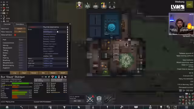 03:40:09In RimWorld wird die Charakterentwicklung detailliert betrachtet. Die Leidenschaften ('Flammen') beeinflussen die Geschwindigkeit des Lernens und die Moral. Die Siedler leveln ihre Fähigkeiten, um eine Chance gegen die Voids zu haben. Währenddessen wird das Raumschiff erweitert, um Platz für ein wachsendes Kind und Ausrüstung zu schaffen. Die Sorge besteht darin, die Kolonie bis zum Start des Mörserangriffs am Leben zu halten und eine Flucht vorzubereiten.