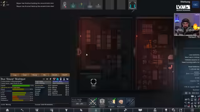 04:04:55Die Rekrutierung von Slayer führt zu einer drastischen Zunahme des Koloniewertes auf über 800.000, was die Bedrohung durch feindliche Raids, insbesondere durch Void, massiv erhöht. Die Streamer plant, Slayer in eine Kampfmaschine zu verwandeln, doch die Gefahr besteht darin, dass Slayer ausflippen oder die Kolonie verlassen könnte. Trotz der Bedenheiten wird ein schneller Ausbau des Raumschiffs forciert. Bevor dies geschehen kann, müssen die Kolonisten einem heftigen Raid mit etwa 80 Neandertalern standhalten, der die Kolonie an den Rand der Vernichtung bringt.