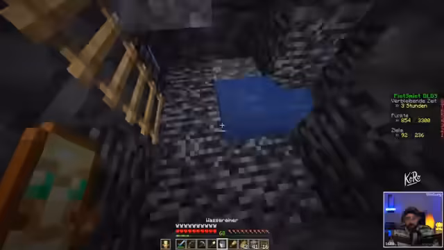 01:28:55Die aktuelle Punktzahl wird diskutiert, und es wird festgestellt, dass man über 900 Punkte haben wird, wenn beide Spieler in das Loch springen. Es wird überlegt, ob man neue Spitzhacken craften soll und woher man Blöcke zum Hochbauen bekommt. Einer der Spieler ist bereits aus dem Loch entkommen, während der andere noch darin feststeckt. Es wird überlegt, ob man die Pinsel noch benötigt und ob man einen Wolf suchen und weitere Amadello-Sachen finden soll. Einer der Spieler hat Ohrenschmerzen, weil er sich auf der Leiter nicht kratzen konnte. Es werden Wassereimer und eine Diamant-Spitzhacke mitgenommen. Es wird festgestellt, dass ein Diamant fehlt, um eine Spitzhacke herzustellen, und diese soll mit Efficiency verzaubert werden. Es wird überlegt, wie viele Crying Obsidian man benötigt, und ob man noch Kohle hat. Die Möglichkeit, Crying Obsidian beim alten Portal zu finden, wird in Betracht gezogen. Es wird beschlossen, den VOD zu überprüfen, um festzustellen, ob sich dort Crying Obsidian befindet.