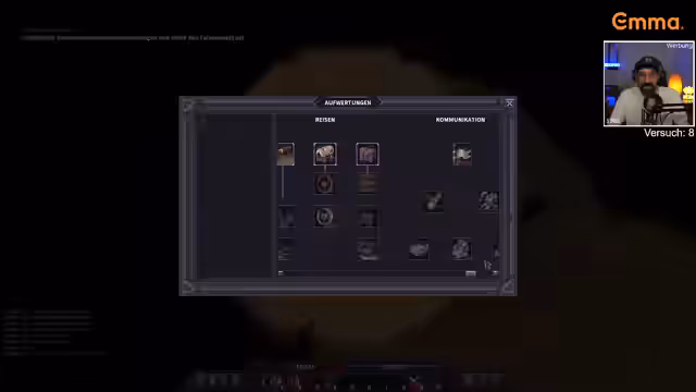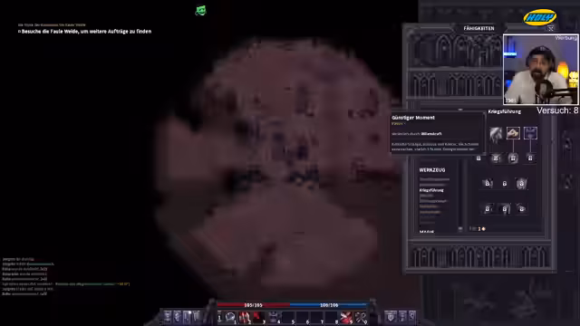 08:08:33Der Streamer erkundet die Umgebung und deckt Fragezeichen auf, die auf interessante Orte oder Gerüchte hindeuten. Bei der Untersuchung einer Kapelle stößt er auf gefährliche Gegner und erleidet erheblichen Schaden. Er besitzt wertvolle Gegenstände wie ein Bernstein-Amulett, benötigt jedoch dringend eine Rüstung, um die Überlebenschancen zu erhöhen. Jede Entdeckung bringt neue Informationen.