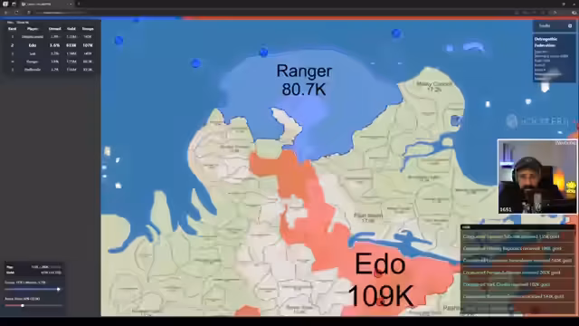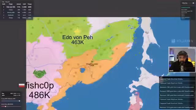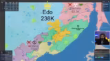00:21:35Ein Spiel mit sechs Spielern beginnt auf einer Japan-Karte. Es handelt sich um ein Free-for-All ohne feste Teams. Der Streamer gibt grundlegende Tipp, wie zum Beispiel die Bedeutung der Bevölkerungsanzahl für das schnelle Nachwachsen von Truppen. Das Spiel beginnt mit einer hektischen Phase, in der die Spieler versuchen, sich auszubreiten und ihre Positionen zu sichern. Freundschaftsanfragen werden ausgetauscht, aber auch erste hinterlistige Aktionen und Verrate sind bereits spürbar.