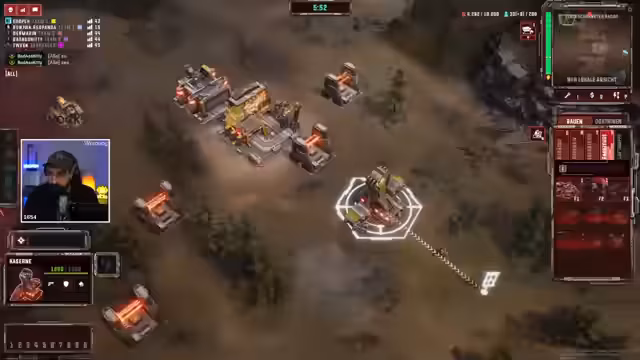 01:04:06Der Stream beginnt mit den Spielern, die ihre Startpositionen im Spiel Tempest Rising besetzen. Es kommt schnell zu Missverständnissen und ersten Angriffen, als ein Spieler namens Ranger einen anderen Spieler sofort angreift, was dieser als Kriegsakt auffasst. Es entwickelt sich ein Dialog über die Regeln und Absichten, wobei die Farben der Spieler in der Lobby, die durch ihre Namen codiert sind, für Verwirrung sorgen und die Orientierung auf der Karte erschweren.