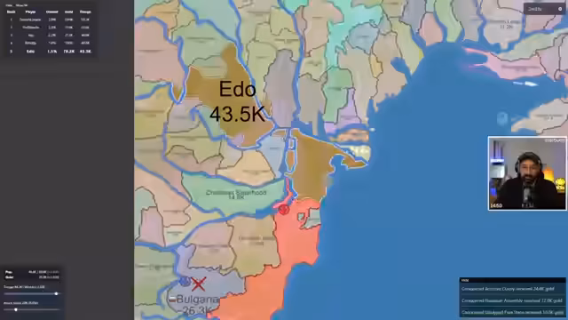 11:32:03Die Runde neigt sich dem Ende zu, und Edo baut eine massive Übermacht auf, die den Sieg von mehreren Spielern unmöglich macht. Es kommt zu最后的Auseinandersetzungen, in denen Edo die meisten Landstriche an sich reißt und mit 25 Millionen Einheiten als unangreifbar gilt und somit den Sieg erringt.