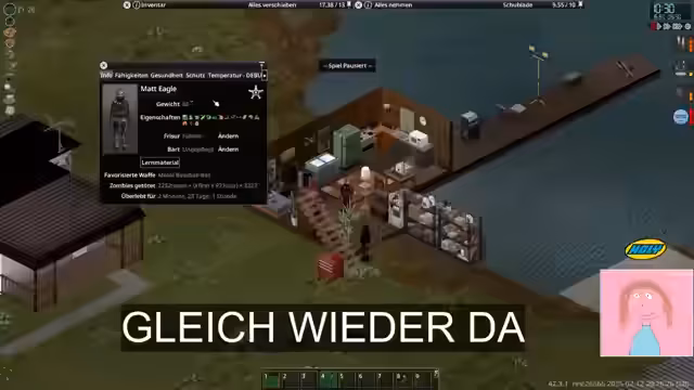 03:12:21Entgegen ursprünglicher Pläne wird Project Zomboid heute etwas früher gestartet, was im Chat positiv aufgenommen wird. Der Plan ist es, die Survivor-Häuser zu plündern und zu looten. Bevor das Spiel startet, gibt es technische Schwierigkeiten mit dem Stream und dem Internet, was zu Verzögerungen und Sorgen um den Stream-Status führt. Nach dem Start wird ein neuer Patch von Project Zomboid bemerkt, hauptsächlich jedoch geht es darum, in das Spiel einzusteigen und den geplanten Loot-Beginn durchzuführen. Die Statistiken des Charakters werden gezeigt und das Ziel ist es, das Shooting-Skill zu erhöhen.