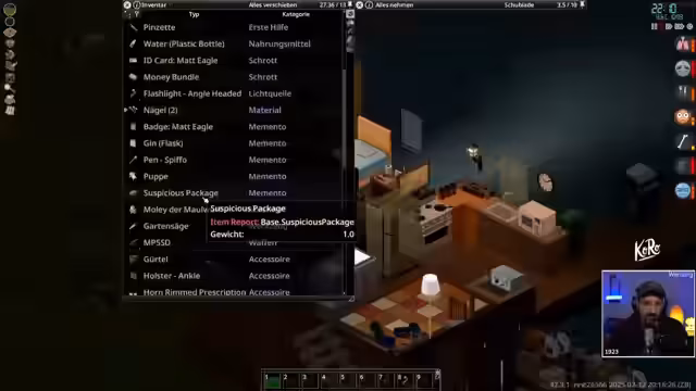05:40:36Nachdem das Stream-Team ein Survivor House geplündert hat, wird der gefundene Gegenstandskatalog durchgegangen. Dies umfasst diverse Schematics für Waffen und Werkzeuge, wobei das Broken Katana als besondere, wenn auch defekte, Nahkampfwaffe identifiziert und behalten wird. Besonders erwähnt wird der große Erfolg der Beute, da eine erhebliche Menge an Munition sichergestellt werden konnte. Der Streamer äußert erneut seine sehr hohe Meinung von Project Zomboid, indem er es als das beste Survival-Spiel mit der besten Atmosphäre bezeichnet und bekräftigt, dass die vielen kostenlosen Updates und die aktive Entwicklung einen bedeutenden Pluspunkt für das Spiel darstellen.