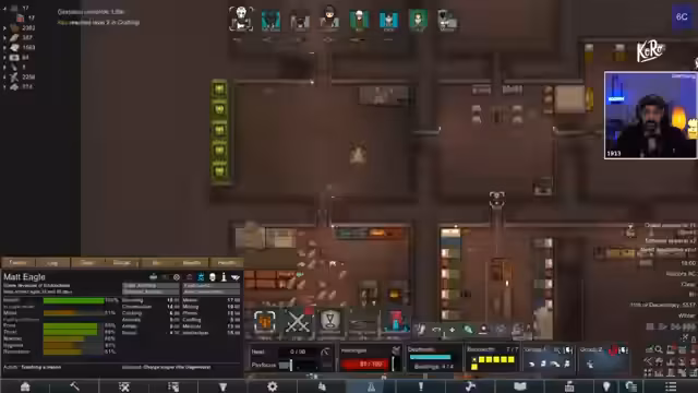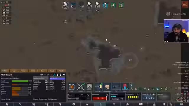 00:15:49Der Fokus liegt auf der RimWorld-Kolonie, die nach einem sehr schwierigen Run mit vielen Toten scheinbar eine kleine Chance auf Besserung hat. Der Streamer berichtet über den aktuellen Stand: Der Hauptcharakter Matt ist im Koma, die Kolonie hat sieben Mitglieder, darunter zwei Vampire, und der Koloniewert ist hoch. Ein zentrales Thema ist die Warnung vor einem bevorstehenden Kultisten-Raid, dem direkt ein 100-köpfiges Imperium-Raid folgen wird, was die Lage extrem gefährlich macht.
