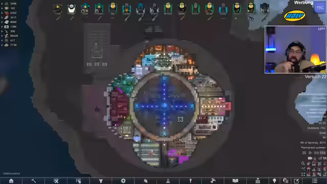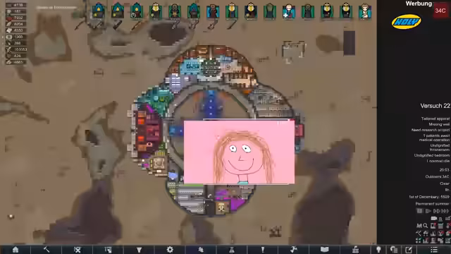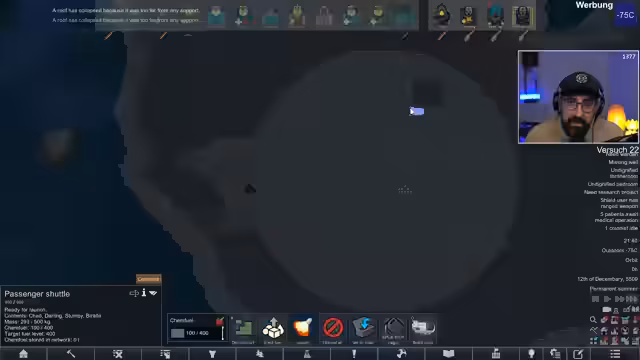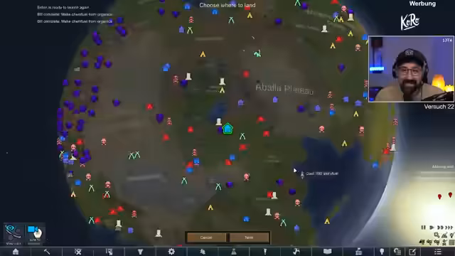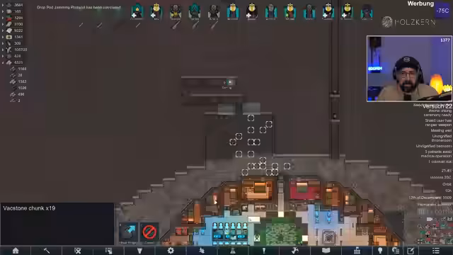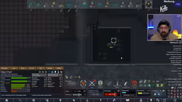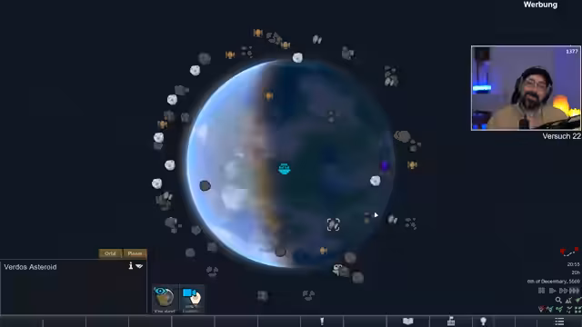00:18:15Nachdem der Streamer eine persönliche Wette mit dem Chat über das Überleben der Kolonisten abgeschlossen hat, wird der Fokus auf die aktuelle Situation der Kolonie gelegt. Der letzte Sieg gegen eine Void-Stadt hat den Koloniewert auf 26 Millionen gesteigert und das Raumschiff ist vollgepackt mit Beute. Trotz des großen Reichtums ist Misaki schwer krank und mehrere Kolonisten fehlen noch lebenswichtige Implantate. Der Plan ist klar: Das Sternensystem zu verlassen, eine Basis auf einem Asteroiden zu errichten und das Raumschiff zu starten, um den 15-tägigen Angriff der Void zu überstehen.