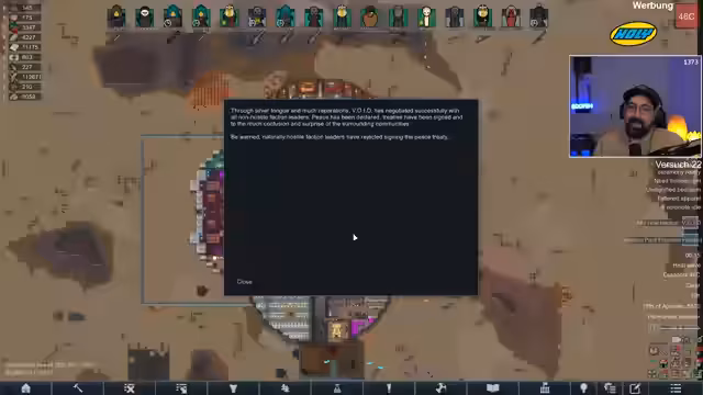 04:41:46Die reaktionären Void starten einen finalen Angriff, um Jenny zu befreien und die Siedler zu vernichten. Ein künstlicher Solarflare und ein Fallout sorgen für massive Störungen. Der Streamer und seine Kolonisten verteidigen sich mit aufgerüsteten Waffen und Trinket-Kräften gegen eine Übermacht an angreifenden Monstern und Droppods.