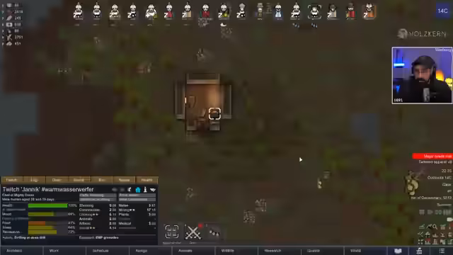 00:09:52Der Stream beginnt mit dem Begrüßung des Chats und Edo stellt klar, dass es heute um den Matthäus TrimWorld Run geht. Es handelt sich um eine kleine Sidequest, da der offizielle RimWorld Episode 6 nicht gespielt wird. Ziel ist es, die Figur Chad vom Planeten zu bringen. Edo erwähnt eine Wette, bei der alle Kolonisten bis zum Raumschiffstart überleben sollen. Der Stream startet mit einem Cliffhanger, bei dem drei Termiten die Kolonie bedrohen.