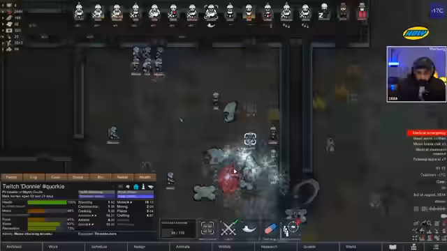 06:49:34Der Streamer berichtet über intensive Kämpfe mit feindlichen Gruppen, insbesondere gegen Breacher und andere Raid-Arten. Er erklärt seine Verteidigungsstrategien, einschließlich der Nutzung von Kill-Zonen, Fallen und Waffensystemen wie Rocket Launchern. Er äußert Besorgnis über den Zustand seiner Kolonisten, die durchgehend verletzt sind und schlechte Moral haben. Trotzdem versucht er, die Moral durch Dosen wie Crack-Kokain zu stabilisieren und betont die Wichtigkeit von guter Versorgung und medizinischer Versorgung. Der Streamer zeigt, wie er unter Druck versucht, Ressourcen effizient zu verwalten und das Beste aus der schwierigen Situation zu machen.