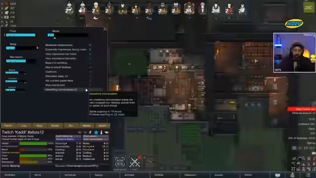 07:04:42Es verbleiben nur noch neun Tage, und die Klinik der Kolonie ist bereits stark beansprucht. Es wird betont, dass ein bis zwei Tage zur Erholung benötigt werden, während die Kolonisten Leichen und Bewusstlose versorgen. Der Schwierigkeitsgrad des Runs wird als höher als erwartet eingeschätzt, was die Notwendigkeit unterstreicht, die Killbox zu reparieren und die Verteidigung zu verstärken. Es wird ein besonderer Dank an Prime-Subs und Follower ausgesprochen, während das Ziel, mit Chat zu entkommen, oberste Priorität hat. Die Möglichkeit, dass sich einige Kolonisten opfern müssen, wird in Betracht gezogen. Es wird festgestellt, dass Maxim und Turi eine neue Beziehung eingehen, was zur Errichtung eines neuen Doppelbettes führt. Fallen werden aufgrund der eingeschmolzenen Mechanoiden wieder aufgebaut, um die Verteidigung zu verstärken. Die Interaktion mit dem Chat wird als wichtiger Bestandteil des Streams hervorgehoben, was die Entscheidung gegen NoPause-Gameplay beeinflusst. Belagerungen und Angriffe nehmen zu, was die Notwendigkeit schneller Reaktionen und strategischer Entscheidungen unterstreicht. Der Einsatz von Mindnapserum und Drogen zur Stimmungsaufhellung wird fortgesetzt, um die Kolonie stabil zu halten.