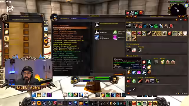 00:17:47Der Streamer wechselt die Talente seines Priestes zu reinem Shadow Priest, um den Schadensbonus der neuen Ausrüstung optimal zu nutzen. Gleichzeitig wird das volle Inventar als großes Problem identifiziert. Um Platz zu schaffen, wird versucht, Gegenstände zu verkaufen und zu verzaubern. Für eine spezielle Verzauberung wird eine Silberrute benötigt, für die die Gilde Hilfe anbietet. Es wird die Diskussion über die Wichtigkeit von Gold ab Level 40 fortgesetzt, da Mounts und Reparaturen kaum noch Kosten verursachen.