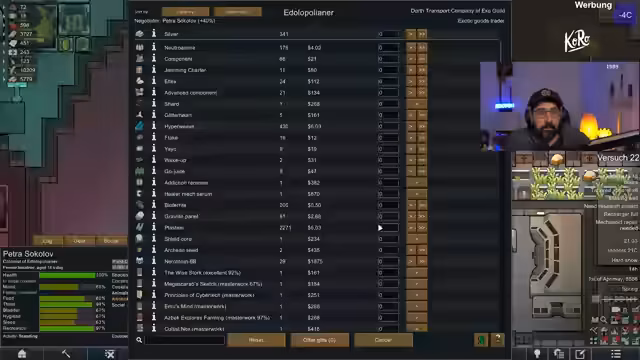 02:54:53Nach dem Kampf besucht der Streamer einen exotischen Händler. Dank des wertvollen Nerotonin-Minerals verfügt die Kolonie über enorme finanzielle Mittel, was es ermöglicht, nützliche Gegenstände zu erwerben. Insbesondere Trinkets aus der Darkest-Dungeon-Mod werden gekauft und gesammelt. Dies führt zu einer Verbesserung der Beziehungen zu den 'Exo-Guilds', weltraumbasierten Handelspartnern, mit denen die Kolonie ihre Freundschaft auf 100% steigert und Zugang zu wichtigen Handelsrouten erhält.