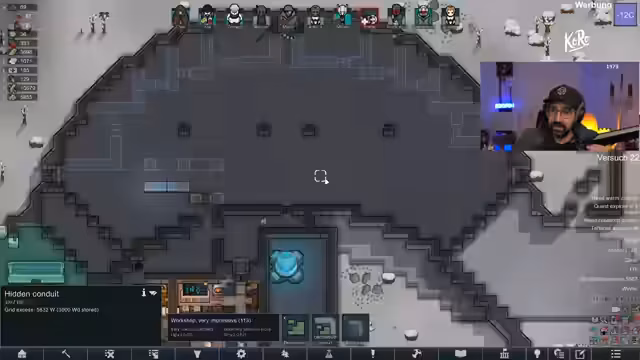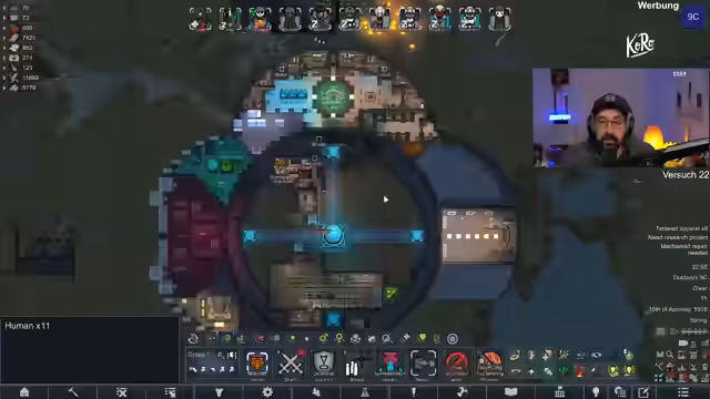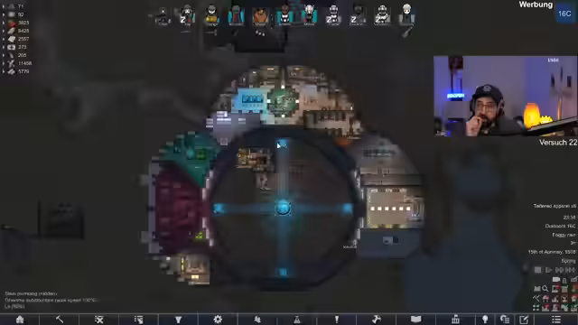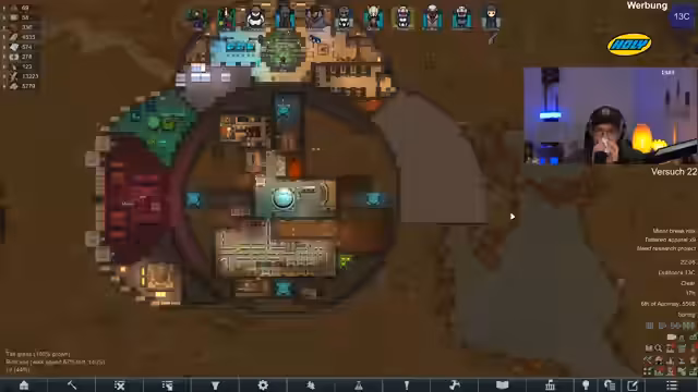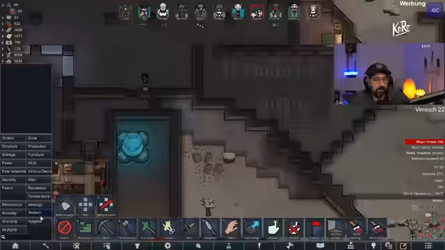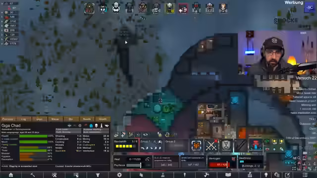 03:11:28Der Bau wird durch einen Angriff der Manhunter-Bären unterbrochen. Gleichzeitig entsteht ein Problem mit der Stromversorgung, da mehr Uran benötigt wird. Der Chat ist weitgehend inaktiv, was die Koordination erschwert. Um die Nahrungssicherheit zu gewährleisten, wird eine Küche eingerichtet und nur "Raw Food" und "Simple Meals" in den großen Kühlschränken gelagert. Aufgrund eines drohenden Void-Angriffs mit "Doomday-Raketen" ist eine schnelle Entscheidung nötig, da das Raumschiff noch nicht vollständig einsatzbereit ist.