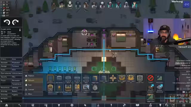 03:02:31Der Stream beginnt mit einer Bewertung der "Void"-Monster und der Zuverlässigkeit der "Trinkets". Das Hauptziel ist der Bau eines Raumschiffs, wobei der Fokus auf Gestaltung und Funktionalität liegt. Die ersten konkreten Bauarbeiten umfassen die Installation von "Space Base Furniture" wie einer "Spacer Lamp" und einem "Animal Bed". Gleichzeitig wird die Logistik angegangen, da der Platz knapp wird und die Rohstoffvorräte, insbesondere Holz und Nahrungsmittel, zur Neige gehen. Um Platz zu sparen, werden Fundamente entfernt und bestehende Räume umstrukturiert.