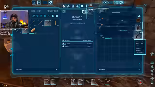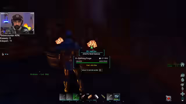 00:49:44Die Gruppe beginnt mit der Farmtour, um Ressourcen zu sammeln. Mit dem Ankylo werden Kristalle vom Berg abgebaut, während der Streamer mit dem Arctos Metalle erbeutet und Kreatin von Insekten und Kabutos sammelt. Es wird deutlich, dass der Ankylo mehr Gewicht und Schaden benötigt. Die Suche nach Biberbauten zur Beschaffung von Cementing Paste und nach einem Diablos wird fortgesetzt. Parallel werden die inventaren aufgeräumt und es wird Munition für die Jagd hergestellt.