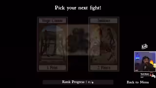 03:54:11Nach Beantwortung einer Frage kann ein Spieler eine neue Waffe wählen, was als Belohnung dient. Die Mechanik des Spiels wird genauer erklärt: Der Spieler muss durch verschiedene Ränge aufsteigen, indem er Bosse besiegt. Stirbt der Charakter, beginnt er den Run wieder am Anfang, was den Schwierigkeitsgrad erhöht. Der Streamer kämpft sich mit verschiedenen, oft unkontrollierbaren Waffen wie der Spieß oder Axt voran und stößt auf einen besonders herausfordernden Boss, der ihn mehrmals besiegt.
