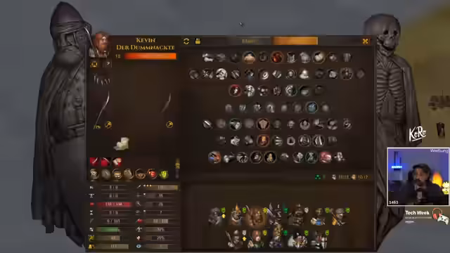 00:10:43Die Session startet mit Battle Brothers. Der Streamer will Champions jagen und nach legendären Items suchen. Sein Team, das sich im Endgame befindet, besteht aus zwölf Mitgliedern, darunter der Holy Crusader Leon, die Hexe Kaddi, der Druid Keklack und die verletzte Priesterin Suki. Suki hat ein permanentes kaputtes Knie und erhebliche Attribute verloren, was ihren Einsatz stark einschränkt. Das Ziel ist es, einen Endboss zu besiegen, was viel Farmen und Stärkung der Truppe erfordert.