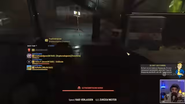 00:00:45Zusammen im Spiel angekommen, stellt der Streamer seinem Mitspieler die Ausstattung für den bevorstehenden Raid bereit. Dies beinhaltet eine Blue Ridge Caravan Rüstung, ein Flanellhemd für Intelligenzbonus und diverse consumable Items wie Anführer-Wackelpuppen und Red Away. Das Ziel ist das schnelle Leveln bis Stufe 50, um das bevorstehende Ghoul-Update spielen zu können. Nach der Ausrüstung wird der Mitspieler ins Team eingeladen, um gemeinsam in den Raid gehen zu können.