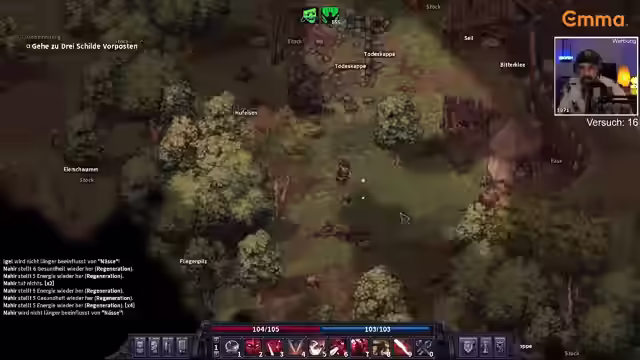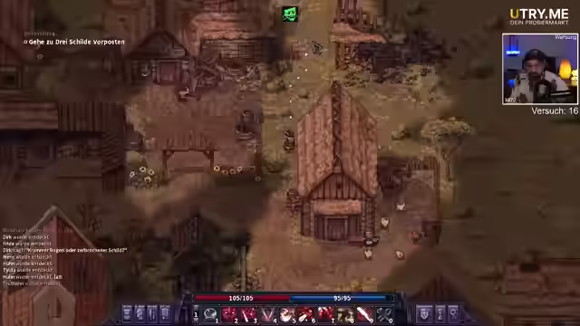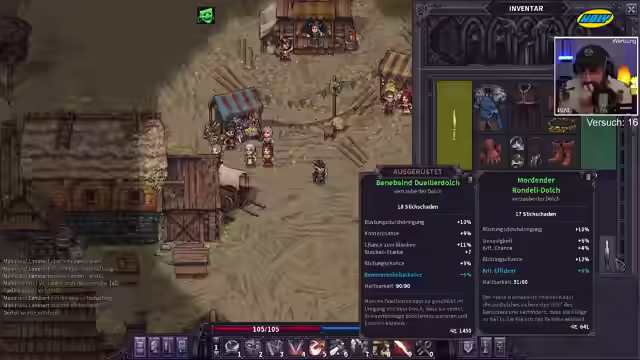 03:40:54Es werden schnell noch zwei weitere Quests erledigt, um 3-4.000 anzusammeln und dann mit der Kutsche in die südlichere Stadt zu fahren, in der Hoffnung, dass der Jahrmarkt noch da ist und ein T4-Dolch verkauft wird. Der Streamer improvisiert und nutzt keine Spoiler oder Bildtipps. Gestern wäre er fast gestorben, aber der Hund ist weggelaufen, weil er seinen Meister getötet hat. In der Stadt wird ein Zimmer gemietet, um den Bonus zu holen. Es wird erklärt, dass man bei Levelaufstieg einen Attributspunkt und einen Skillpunkt bekommt. Ein Zuschauer will eine Mechanik verraten, die der Streamer übersehen hat, aber das wird abgelehnt. Es werden Steine zusammengeführt und verkauft. Der Streamer will direkt die neue Quest annehmen und entscheidet sich für eine Kopfgeldjagd. Es wird geklärt, dass Gegenstände in der Truhe in der Taverne nicht verschwinden. Es werden Identification Scrolls und Tränke gekauft. Der Streamer überlegt, ob er den Trank der Wut auf sich oder auf Gegner werfen soll. Das Zeug wird in die Taverne in die Kiste gelegt. Es wird Essen gekauft, nachdem der Streamer sein Portemonnaie vergessen hat. Er will auch noch selbst kochen mit den Gewürzen in der Karawane. Die Karawane campt gerade hier und er will schnell die drei Quests erledigen, Kohle einsacken und dann wieder mit dem Taxi runter und hoffentlich einen geilen Dolch schnappen. Die eigene Basis ist die Karawane, die man abbrädet und immer besser macht. Das Game wird empfohlen und es wird gleichzeitig Kaffee getrunken. Es wird erklärt, dass das Spiel rundenbasiert ist. Der Streamer hat sich einen Tassenwärmer gekauft. Es wird über die gefährlichen Billhook-Dudes gesprochen, die es auch bei Battle Brothers gibt. Es wird überlegt, ob man den mit dem Bogen treffen kann. Der Kampf wird nicht so smart approacht und es wird umgeleitet. Es wird über Crits und Bleed Damage gesprochen. Es werden Heilsalbe und Flohkraut angewendet. Es wird sich auf Battle Brothers und Menace gefreut. Der Streamer kämpft lieber ein bisschen da oben, da ganz schön viele kommen. Es wird sich für den vierten Sub bedankt.