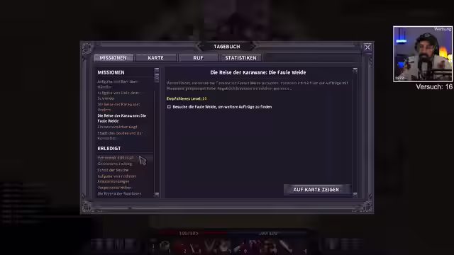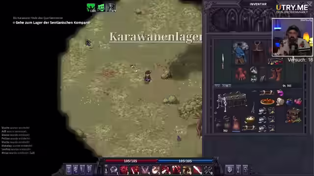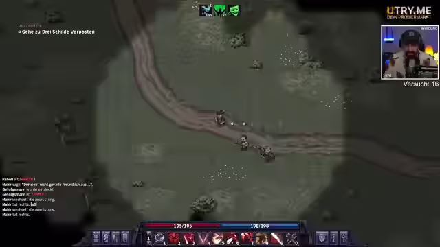 06:52:53Der Streamer findet den Quartiermeister und wird Zeuge einer Konfrontation. Zwei Männer beschuldigen den Quartiermeister, Unglück zu bringen. Der Streamer greift ein, um ihm zu helfen. Es kommt zum Kampf, den der Streamer gewinnt. Ein Zwerg namens Live taucht auf und bietet seine Hilfe an, da er von Varen geschickt wurde. Der Zwerg fragt nach dem Lager der Karawane und schließt sich der Gruppe an. Der Streamer nimmt Eimer, Seil, Lauch und Wildschweinbanner mit. Er überlegt, ob er schlafen soll, ist aber zuversichtlich, sicher nach unten zu kommen. Der Streamer levelt auf und wählt die Fähigkeit "Hartes Ziel", um sich besser gegen Fernkämpfer zu schützen. Er analysiert seine Werte und Fähigkeiten und plant seine nächsten Schritte. Der Streamer vermeidet extrem gefährliche Gegner und erreicht sein Ziel. Er überzeugt den Zwerg, sich ihm anzuschließen, und schließt die Quest ab. Der Streamer trainiert seine Beweglichkeit und ersetzt sein altes Banner durch ein neues, das Rufgewinn und Schmerzresistenz bietet. Er stellt fest, dass er müde und hungrig ist und plant, den Stream bald zu beenden.