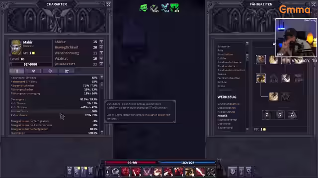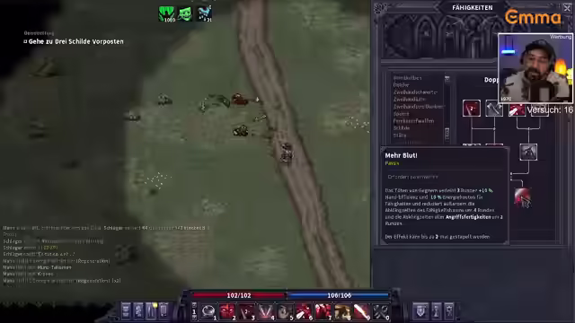 05:01:14Ein Levelaufstieg wird erreicht und 5 Ausweichchancen werden gewählt, wodurch die Ausweichchance auf 37 erhöht wird. Das Ziel ist, über 50% Ausweichen und Blocken zu erreichen. Es wird erklärt, dass zuerst Ausweichen und dann Blocken berechnet wird. Es wird überlegt, ob Wirbelwind oder mehr Blut als nächster Skill gewählt werden soll. Wirbelwind ist ein Skill für den Kampf gegen viele Gegner, während mehr Blut ein passiver Skill ist, der immer funktioniert. Es wird sich für mehr Blut entschieden, da es die Cooldowns reduziert und die Energieeffizienz erhöht. Es wird erklärt, wie der Angriffswurf, das Ausweichen und das Blocken funktionieren. Wirbelwind verursacht bis zur nächsten Runde -62% Konterchance und führt einen Doppelschlag mit 110% Taumelchance aus. Es wird sich für Wirbelwind entschieden, obwohl er wahrscheinlich nicht so häufig benutzt werden kann. Es wird die Angst geäußert, mit Wirbelwind in den Tod zu springen. Handeffizienz beeinflusst die offensiven Eigenschaften einer Waffe in der jeweiligen Hand. Es wird mehr Blut geskillt und für das nächste Level Unaufhaltsam geplant. Der Bogen wird im Dungeon wieder benutzt. Es wird gegen mehrere Gegner gekämpft, darunter ein Magier. Es wird beschlossen, den Magier zuerst zu töten. Das Camp wird verteidigt und Heidelbeeren werden gegessen. Es wird die T3-Quest angegangen und betont, dass komplett safe gespielt wird. Ein Hexenmeister wird als sehr gefährlich eingestuft. Es wird festgestellt, dass Magie viel Schaden verursacht und schwer auszuweichen ist. Es wird überlegt, ob Resistenzen benötigt werden. Es wird ein Dietrich gefunden und festgestellt, dass es keine Metaprogression gibt. Es wird betont, dass smart gespielt und im Schatten versteckt werden muss. Es wird sich auf den neuen Battle Brothers Content gefreut.