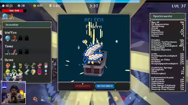 00:15:35Es wird festgestellt, dass das Spiel Vampire Survivors ähnelt, aber mit zusätzlichen Elementen wie Springen. Der Fokus liegt auf der Verbesserung des Knochen-Charakters, wobei Angriffsgeschwindigkeit als besonders wichtig erachtet wird. Ein Händler bietet verschiedene Gegenstände an, darunter einen Schraubenschlüssel und Items, die Blutmale verursachen. Der Knochen-Charakter wird als stark eingeschätzt. Es wird ein Leuchtfeuer entdeckt, das sich in eine Heilzone verwandeln kann. Projektilgeschwindigkeit wird als potenziell nützlich angesehen. Das Level wird als schwieriger eingestuft. Es werden verschiedene Power-Ups gesammelt, darunter goldene Handschuhe und zusätzliche Sprünge. Der erste Boss wird erreicht und besiegt, was ein Achievement freischaltet. Nach dem Bosskampf werden weitere Level absolviert und gegen Geister gekämpft, um den Charakter weiter zu verbessern. Es wird ein Portal entdeckt, das zu neuen Herausforderungen führt. Der Streamer stirbt absichtlich, um den Level abzuschließen und einen neuen Rekord aufzustellen. Es werden Quests abgeschlossen und Belohnungen freigeschaltet, darunter neue Waffen und Items. Der Revolver wird als potenziell nützliche Waffe in Betracht gezogen.