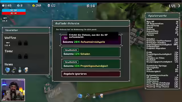 00:56:02Es wird überlegt, ob es sich lohnt, noch zu farmen oder in den nächsten Level zu gehen. Der Streamer entscheidet sich, in den nächsten Level zu gehen. Es wird festgestellt, dass das Spiel ohne großes Marketingbudget erfolgreich ist. Es wird eine neue Wette platziert, ob der Streamer den Boss killt. Der Streamer ist ein Solo-Entwickler und das Spiel macht Spaß. Der Streamer mag den Aura Char, aber auch den Skelett mit dem Movement Speed. Es wird überlegt, welches nächste Level gespielt werden soll. Der Skelett mit dem Skateboard wird bevorzugt. Es wird überlegt, ob das Spiel auf Deutsch oder Englisch gespielt werden soll. Es wird beschlossen, mit dem Skelett-Dude unterwegs zu sein und zu farmen. Es werden verschiedene Items ausgewählt, darunter kritische Trefferchance und Angriffsgeschwindigkeit. Es wird überlegt, XP zu verbannen. Es wird beschlossen, XP zu nehmen. Es wird eine neue Wette platziert, ob der Streamer beide Bosse besiegt. Es werden verschiedene Items ausgewählt, darunter Projektilband und Angriffsgeschwindigkeit.