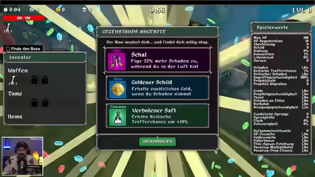 01:59:54Es werden weitere Items freigeschaltet, darunter ein Lebensraum-Buch und verschiedene Boni wie Projektil- und Tech-Speed. Es wird die Bedeutung von Größe hervorgehoben und darauf hingewiesen, dass das Verteilen von Punkten auf alle Attribute zum Verlust von Punkten führen kann. Eine Kreditkarte wird erwähnt, und es wird festgestellt, dass der Händler "Kurszeug" verkauft. Es wird überlegt, einen "super greedy Build" zu machen, der auf Glück und XP-Zuwachs basiert. Es wird erwähnt, dass ein höherer Schwierigkeitsgrad besseren Loot und mehr Geld bringt. Es wird festgestellt, dass jemand an der Tür ist, und es wird sich entschuldigt, kurz helfen zu müssen. Es stellt sich heraus, dass die Nachbarin Hilfe beim Tragen von Sachen benötigt, und es wird betont, wie wichtig gegenseitige Hilfe ist. Nach der Hilfsaktion wird das Spiel fortgesetzt, und es werden verschiedene Items wie Banane und Knochen betrachtet. Es wird die Wahl zwischen Ausweichen, Größe und Projektilen abgewogen. Es wird festgestellt, dass die Preise beim Händler gestiegen sind, je später man kauft. Es wird erwähnt, dass es bereits 19 Uhr ist und das Spiel schnell vergeht. Es wird auf Stoneshard hingewiesen, das im Anschluss gespielt werden soll, und die T4-Ausrüstung wird erwähnt. Es wird sich für Projektile entschieden und Crit bevorzugt. Es wird die Gabel gekauft, in der Hoffnung, einen Mega-Quid zu erhalten. Es werden Quid-Chance und große Epic-Bananen in Betracht gezogen und sich gefragt, ob es auch Ultra-Quids gibt.