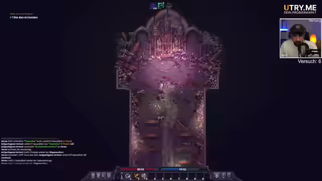 01:33:21Der Streamer kämpft mit dem Tutorialsystem, findet es aber trotzdem spaßig. Er versucht, seinen Bogen zu verzaubern, stellt aber fest, dass die Verzauberung nicht ideal für den Bogen ist. Er fühlt sich überladen mit Items, kann seinen Zustand nicht perfekt managen und wird von Nebenwirkungen wie starken Schmerzen und Rauschzuständen beeinträchtigt, was die Kämpfe erschwert.