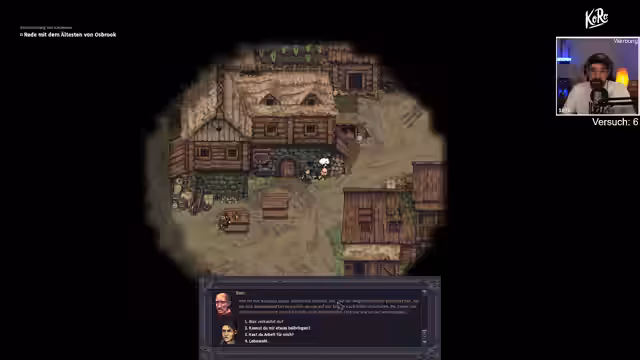 04:00:11Die Pixel-Grafik des Spiels wird positiv hervorgehoben, besonders die detailverliebte Ausgestaltung der Umgebung wie der Taverne, die wie ein Wimmelbild wirkt. Der Streamer diskutiert, ob auch jüngere Menschen diesen Grafikstil mögen, da er zeitlos und nicht von modernen Effekten abhängig sei. Mit dem Zuschauer Chad wird eine kleine Wette abgeschlossen, ob der Streamer bis 1 Uhr überlebt. Man interagiert mit den Dorfbewohnern, um Informationen über Aufträge, Händler und Handwerker zu sammeln und nimmt erste Quests an, wie die Beschaffung von Weinbrand.