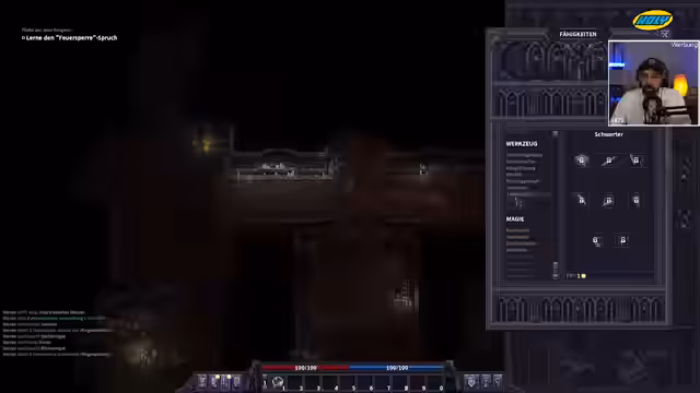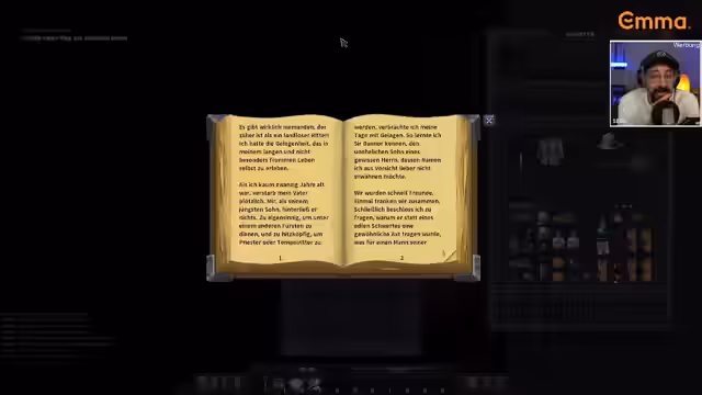 00:42:13Nachdem die Beinverletzung mit einer Schiene und Heilsalbe behandelt wurde, entdeckt der Streamer eine Tagebuchseite, die einen Teil der düsteren Hintergrundgeschichte der Abtei enthüllt. Er findet das Buch der Pyromantie, das ihm den Feuersalbe-Zauber verleiht, und sammelt Gegenstände wie einen Eimer und eine Kriegssense. Aufgrund des begrenzten Inventars trifft er strategische Entscheidungen, welche Gegenstände er mitnimmt. Er lernt auch die Grundlagen des Kampfsystems und die Wichtigkeit von Rasten zur Regeneration.