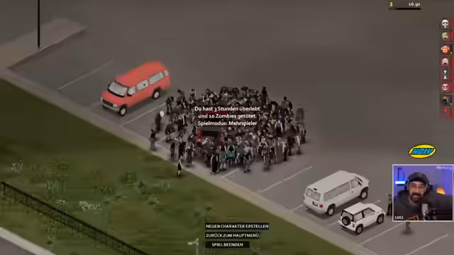 06:02:14Der Streamer spielt Project Zomboid und berichtet von seinen Erlebnissen auf dem Server. Er ist zwischen Louisville und West Point unterwegs und versucht, mit seinen Mitspielern zu überleben. Er ist bereits gestorben und spricht über die Schwierigkeiten des Spiels, insbesondere das Überleben im Team. Er erwähnt auch, dass sie neue Autos benötigen und planen, in eine Mall zu fahren, um dort Loot zu sammeln.