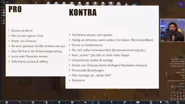 02:18:16Die Kontraliste des Streamer-Jobs ist länger. Es gibt viel Arbeit abseits vom Spielen, wie Versicherungen, Steuern, Preisverhandlungen und Verwaltungsarbeiten. Man ist für alleinständig verantwortlich und muss selbst für sein Einkommen sorgen. Krankheit oder Urlaub bedeutet kein Geld, da niemand die Arbeit übernimmt. Man ist mit dem Druck konfrontiert, funktionieren zu müssen, da kein festes Gehalt wie angestellt existiert.