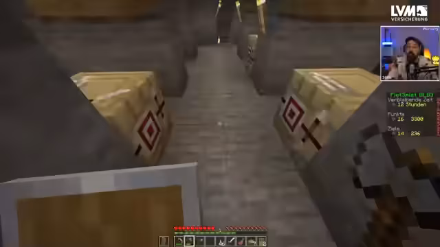 03:50:30Das Streamer-Dorf ist voller Kinder, die der Streamer fütterter. Er bemerkt Villager-Infos, die sich von Tag zu Tag ändern, und plant, einen Skelett-Bogenschützen zu fangen. Dafür baut er ein Setup mit Booten, um Skelette einzufangen. Leider wird ein Papagei durch ein Skelett getötet, was im Streamer Frustration auslöst. Das gesamte Unterfangen gestaltet sich chaotisch und hektisch.