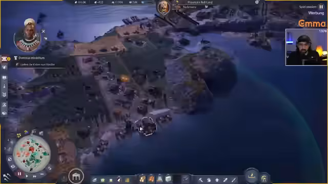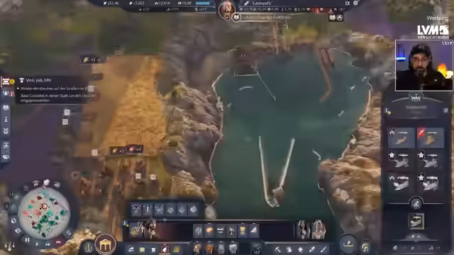 03:49:49Die Hauptinsel leidet unter ständigen Problemen wie mangelnden Arbeitskräften, unzufriedener Bevölkerung und knappen Ressourcen wie Hafer und Fisch. Dies zwingt zu einem ständigen Auf- und Abbau von Gebäuden und führt zu einem Gefühl des permanenten Scheiterns. Der Streamer erkennt, dass er dringend expandieren muss, um dem Platzmangel zu entkommen. Parallel dazu eskaliert die Situation militärisch: Der Verteidigungspakt mit NPCs wird genutzt, um Concordia anzugreifen. Eine plötzliche Pandemie, der Streamer wird jedoch einen Krieg führen, sobald militärisch und wirtschaftlich möglich ist.
