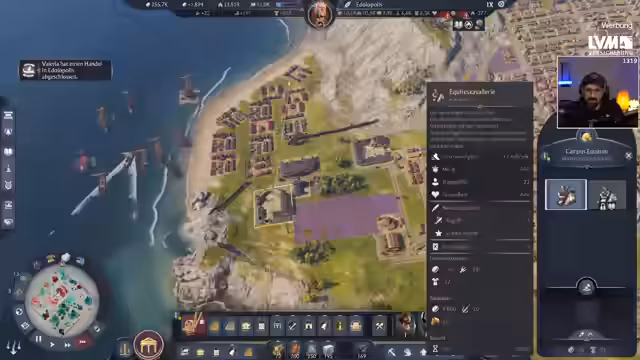 04:09:11Der Fokus verlagert sich vollständig auf die Kriegsvorbereitung. Es werden Katapulte, Legionäre, Bogenschützen und Schleuderer rekrutiert und aufgerüstet. Forschungen zur Kostenreduzierung des Militärs werden vorangetrieben. Zeitgleich wird versucht, eine wichtige Handels-Quest abzuschließen, bei der wertvolle Dekoration und Delikatessen an das verbesserte Kontor geliefert werden müssen. Der Zeitdruck steigt, da der Streamer vor 18 Uhr eine erobern will und auch die Pest-Krise parallel bewältigt werden muss. Die Pest führt zu sinkender Gesundheit und Zufriedenheit und erfordert das Finden kranker Bürger, was sich als schwierig erweist.