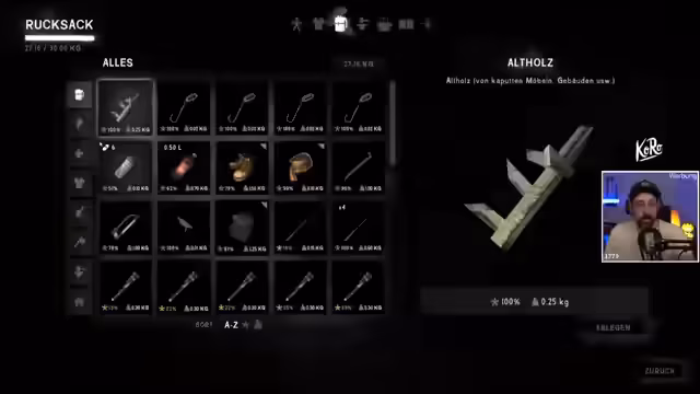 06:26:47Beim Packen seines Inventars ist der Streamer überfordert, da er zu viele Ressourcen besitzt und das Gewicht limitiert ist. Er muss schwerwiegende Entscheidungen treffen, was er mitnehmen und was zurücklassen soll. Die priorisierten Gegenstände sind ein Kochtopf, eine Pfanne, Werkzeug und der Schlafsack. Die primären Ziele für den Trip bleiben das Marschland und die Gebirgsstadt, um dort bessere Ausrüstung und Rezepte zu finden.