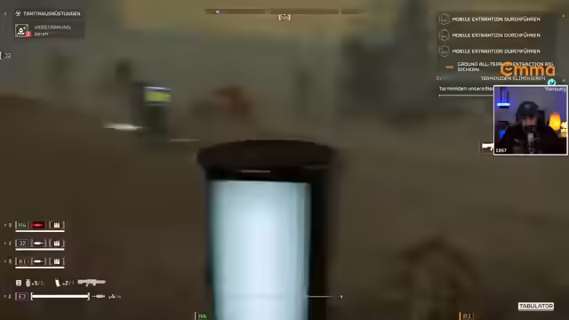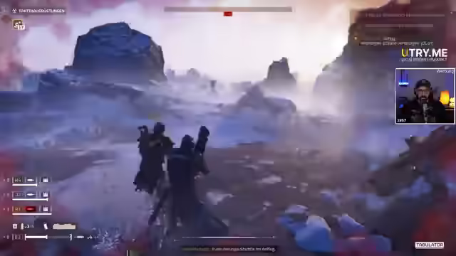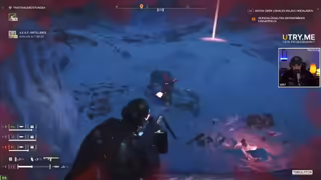 00:08:53Der Streamer wird von seinen Mitspielern beschützt, während er ein Objekt zu einer anderen Seite der Karte schleppen muss. Er scherzt darüber, dass sein Bizeps brennt. Es wird ein Fun Fact über die Zerstörer am Himmel geteilt, die tatsächlich andere Spieler in ihren eigenen Missionen darstellen. Eine Nebenmission wird aktiviert, bei der Artillerie-Munition gesucht und in eine Maschine eingefügt werden muss. Der Streamer demonstriert den Einsatz von Streubomben und erklärt, wie man die Signalstärke einstellt und ein Minispiel absolviert. Er weist auf die Notwendigkeit hin, in eine bestimmte Richtung zu laufen und aus der Pistole zu schießen, da die Munition knapp wird. Nachschub wird angefordert, inklusive Munition und Spritzen zum Heilen. Der Streamer erklärt, wie man Ressourcen abbauen und den Loot einsammeln kann. Teamwork wird betont, besonders beim Tragen von Paketen und dem Wiederbeleben gefallener Kameraden.
