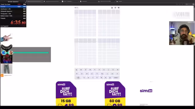 01:33:33Nachdem die technischen Vorbereitungen abgeschlossen sind, startet das angekündigte Browser-Game-Speedrun-Battle zwischen dem Streamer und Kontrahenten wie Edo P. und Kadi TV. Sieben Spiele, darunter Qwerdly, GeoGuessr und ein Wikipedia-Speedrun, bilden die Disziplinen. Das Ziel ist es, als Erster die jeweilige Herausforderung zu meistern. Der Streamer beginnt mit Dragon Ball FighterZ und errät es sofort erfolgreich.