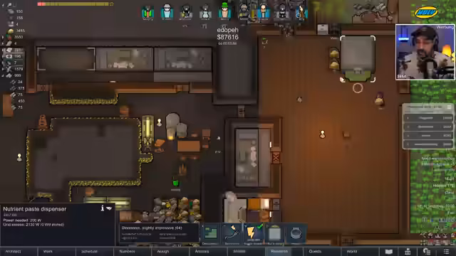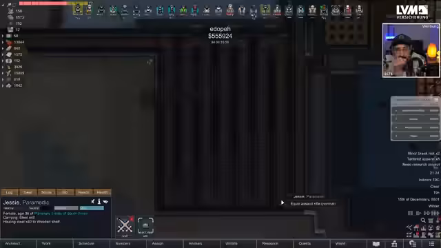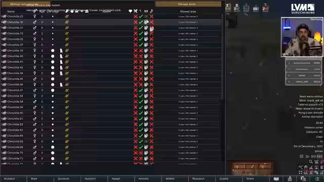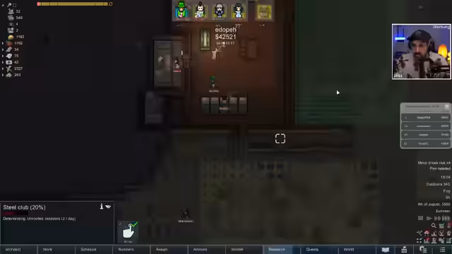 07:03:46Der Streamer fängt mehrere neue Kolonisten ein und integriert sie in die Basis. Das management wird zur Herausforderung, da viele neue Rekruten nur wenige nützliche Skills besitzen und nicht als Crafter, Kämpfer oder Forscher einsetzbar sind. Besonders wird die Notwendigkeit mehrer Mediziner betont, nachdem eine Operation scheiterte und Tiere die gesamte Medizin auffraßen. Die Basis ist überbelegt, was die Effizienz bei der Arbeit und der Verteidigung senkt.