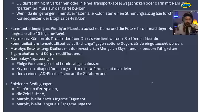 03:48:29Zunächst geht es um die zentrale Figur, Murphy, der im Mittelpunkt des Streams steht und einem Zero-to-Hero-Plan folgt. Es wird eine Stunde lang intensiv über Informationen und Strategien für den Stream diskutiert. Der Streamer beginnt dann mit der praktischen Vorbereitung, indem er ein Gehege für Tiere baut und die erste Statue mit einem Wert von 100 Beauty fertigstellt. Die Forschung ist abgeschlossen und der nächste Schritt ist eine Entscheidung zwischen Deep Drilling, Ground Pen Scanner und Geothermie. Es wird der Bau einer Transportkapsel und die Verwaltung des Camps priorisiert, wobei der Zeitdruck und der Platz 14 im Ranking eine wichtige Rolle spielen. Die Kolonie muss weiter ausgebaut werden, um den Platz zu halten und den Koloniewert zu steigern.