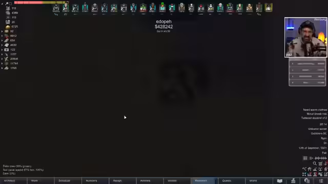 08:05:13Neben den Wetterproblemen bereitet sich der Streamer auf Belagerungs-Raids vor und optimiert seine Verteidigungsanlagen. Er plant, Feinde in eine vorbereitete Feuerfalle zu locken, um große Mengen an Koloniewert zu erlangen. Gleichzeitig experimentiert er mit der Charakter-Entwicklung, indem er Murphy durch Level-ups verbessert und ihm bionische Implantate verpasst, um die Kampfkraft zu steigern. Er analysiert auch die Strategien der Gegner, um deren Angriffe besser abwehren oder für seinen Vorteil nutzen zu können.
