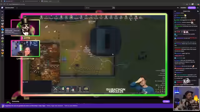 05:45:56Der Streamer befindet sich im Endgame und stellt fest, dass er unerwartet weit vorne im Ranking liegt. Dies führt zu einer strategischen Zwickmühle: Ein höherer Koloniewert zieht stärkere Gegner an, was das Überleben gefährdet. Daher wird beschlossen, den Koloniewert nicht weiter zu maximieren. Stattdessen werden letzte Verbesserungen an der Infrastruktur vorgenommen, wie die Installation von Megascreen-Fernsehern und der Bau weiterer Architekt-Arms. Die finale Verteidigung wird gestärkt, um den erreichten Platz zu halten und auf das Eventende zu warten. Es ist eine Mischung aus Zufriedenheit über den erreichten Erfolg und der Sorge um die finale Abwehr.