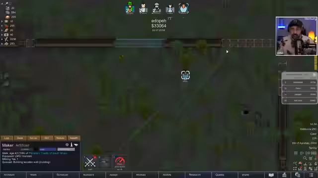 02:25:36Der Start von Rimmenship ist von Stress geprägt. Die Kolonisten leiden unter schlechter Laune, was zu Produktivitätsverlusten führt. Murphy fast einem Anschlag durch einen Kolonisten zum Opfer. Ein Problem wird der unvorhergesehene Insekten-Spawn, weshalb der Bau von Feuerfallen geplant wird. Langfristiges Ziel ist der Bau einer Basis in den Bergen, um sich vor dem erwarteten Tornado in Tag 40 zu schützen. Der Bau der Außenwände wird als grundlegende Voraussetzung für alle weiteren Schritte gesehen.