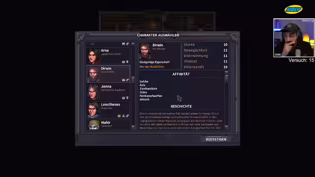 05:40:52Beginnt mit der Vorstellung des Dervish-Charakters, der einen Reisestab, ein Gewand, einen Umhang und Stiefel besitzt. Dieser Charakter ist reich, aber gelangweilt von seinem Leben und bricht deshalb auf. Der Dervish erhält einen Bonus für jeden neu besuchten Ort, was den Erfahrungsgewinn und die Beschöpfungsresistenz erhöht. Er plant, einen neuen, "insane" Build zu spielen, der noch besser sein soll als Ausweichen, nämlich "Ausweichen plus 1". Er fordert den Chat auf, sofort eine Brechstange zu kaufen, da er einen genialen Plan hat. Er kündigt an, dass er einen Doppel-Dolch-Ausweich-Build spielen wird, den er als "Assassin" bezeichnet und der seiner Meinung nach die neue Meta sein wird. Er glaubt, dass dieser Build so stark sein wird, dass er fast schon als Cheaten angesehen werden könnte, aber er ist zuversichtlich, dass er damit nicht sterben wird.