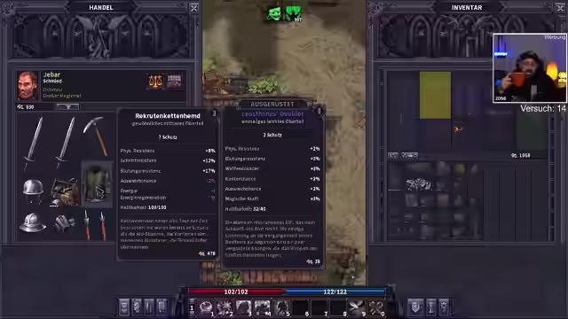 00:29:08Nachdem die Quest erfolgreich abgeschlossen wurde, kehrt der Charakter zur Brauerei zurück, um die Belohnung abzuholen. Es wird überlegt, ob ein neuer Job angenommen werden soll, aber zunächst wird beschlossen, zu schlafen, um die Erschöpfung zu reduzieren. Der Charakter verkauft Bier und andere Gegenstände, um Geld zu verdienen und die Ausrüstung zu verbessern. Es wird überlegt, ob ein Ring verzaubert werden soll, aber der Streamer entscheidet sich dagegen, da der Bonus zu gering ist. Stattdessen wird ein Gemüsesalat zubereitet, um die Immunität zu erhöhen. Der Streamer kauft eine neue Rüstung und Stiefel, um die Verteidigung zu verbessern, und legt die alte Rüstung in den Rucksack. Die Werte des Charakters werden analysiert, wobei der Fokus auf Rüstung, Blocken und Resistenz liegt. Es wird festgestellt, dass die Ausweichchance gering ist und daher nicht weiter verfolgt wird. Der Streamer erklärt die Bedeutung von Standhaftigkeit und Blutungsresistenz und betont, dass er kaum Resistenzen gegen Magie hat.